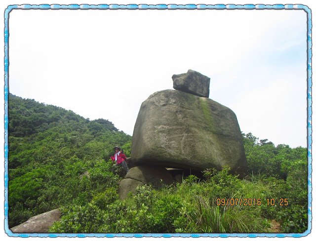 早上與隊友在筲箕灣太興早餐,9.15AM在港鐡站A3出口集合,5 人出席沿巴士總站步往賽馬會診所旁遊樂場,先探位於愛秩序灣廢村的劉.關.張廟,探過廟宇沿路步自小學旁護土牆天梯上引水道,天氣太熱,到引水道小休片刻,其間首領突然出現,原來他追上來了,可能追得太急,加上天氣悶熱,人有點疲累。小休過後點開始轉入林向山谷進發,天氣很悶焗悶,走在林中也有點舉步維艱。走一段後轉上山,開始見到巨石,先看到的是元寶石,其形狀又似屁股,再向上望活佛石及將軍石正屹立在山林中。慢步向上移,走到將軍石下拍大合照,拍過照後沿草林路上攀,山路很陡直,雖然短短一段路也要四十多分鐘才完成。到達車路抖一抖,等人齊後沿車路下大風坳大休。大休後沿柏架山道下山,中段切入金督馳馬徑,向前走一段岔口石級路直上接小馬橋,藍哥預算是走回小馬山電台,但走錯方向,算了,唯有打林直下,出口是寶聯徑晨運園地。沿路下山接回金督徑走至大潭郊野公園牌坊(小馬坑下游)浸水消消暑。浸過水沿馳馬徑前行,水務路下山,洽好在學校的前方,再沿車路步往車站搭25A巴士到灣仔駱克道熟食市場梳洗及下午茶。