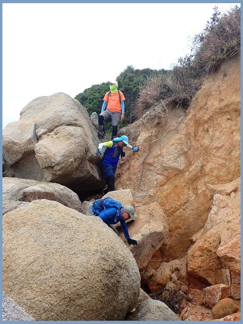 早上搭9點船班入長洲再轉街渡到下徑碼頭(正生書院)下船,到達後開始沿海岸綑遊社長新書推介的奇趣石景「蜂窩岩柱」。芝麻灣半島的花崗岩石好大,有些呈蜂窩狀的好特別,海邊的砂土很紅、很美,但風化頗嚴重,一踏即碎,步過也要小心。當中也有難位,有前人綁了繩索,加上隊友扶助,也不太難,約中午時分到達蜂窩岩柱,就在岩柱旁大石台大休。休後天色不太好,恐會下雨,社長決定走水管路至長沙灣,長沙灣村舍似已荒廢冇人居住,灣內還見魚排有狗吠聲,走過兩灘接回石屎路,沿路上行見車路,右行去芝麻灣碼頭,左邊經懲教署出貝澳,社長選擇搭船,時間尚早,隊友們想步回貝澳,選了沿左邊車路上行,途經芝麻灣懲教所出貝澳搭3m巴士回東涌,今日路線不難,里數不長,約8km,6 小時完成,真的好玩,好玩!